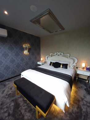 Une chambre à l’esprit Baroque avec un lit King Size (180x200com) équipé d’un miroir au plafond. Une télévision avec accès aux chaine TNT et connectée à YouTube.